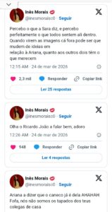 Contudo, para Inês Morais, a indignação de Ariana não passa de encenação. A comentadora foi direta ao sugerir que a concorrente já sabia da relação e que toda a reação não passou de fingimento para as câmaras. Sem esconder o desagrado, deixou mensagens públicas onde acusa a jovem de incoerência e falta de transparência, mostrando-se totalmente descrente em relação à narrativa apresentada no programa.